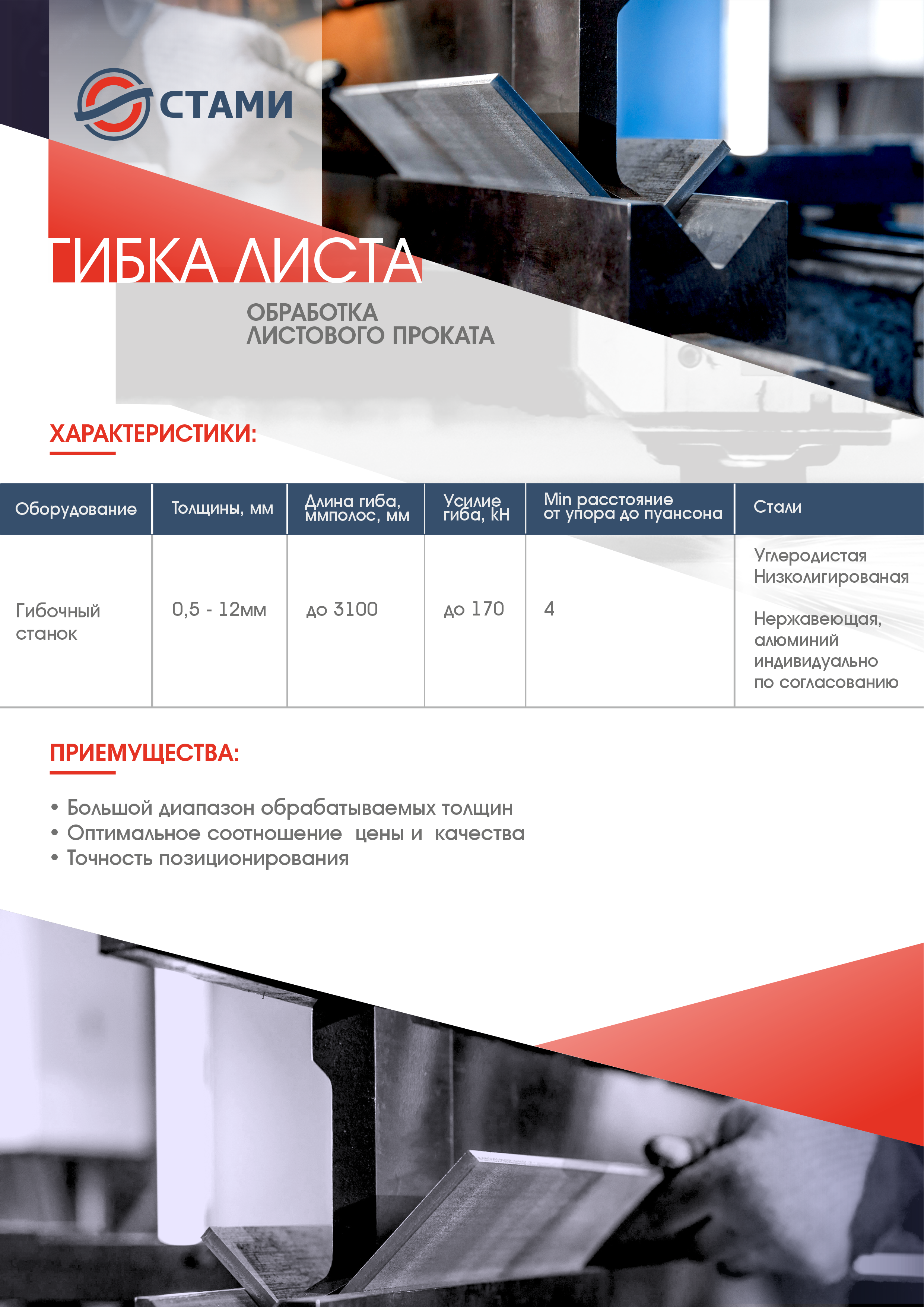 ООО «Сервисный металлоцентр «Стами» производит равнополочный (по ГОСТ 19771-93) и неравнополочный (по ГОСТ 19772-93) гнутый уголок (металлический профиль с Г-образной формой поперечного сечения) из стального штрипса на автоматической линии холодной прокатки способом холодного профилирования толщиной от 2 до 6 мм шириной полки от 25 мм до 160мм и длиной до 12 метров. Гнутый уголок изготавливается из углеродистой стали обыкновенного качества (ст3пс, ст3сп), низколегированной стали марки 09Г2С.